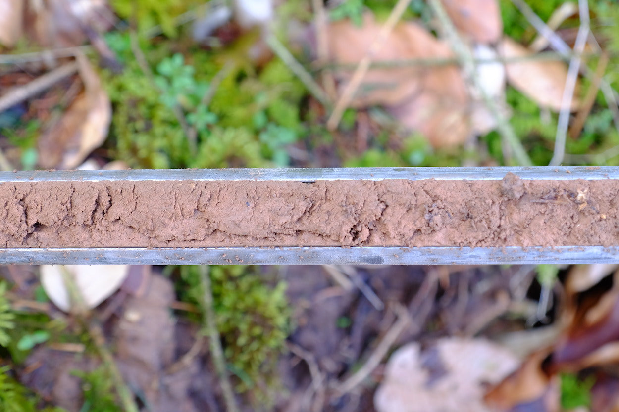 Zuerst nehme ich dazu einen Bohrstock und untersuche die oberste Bodenschicht bis zu einem Meter Tiefe. Hier habe ich eine dicke Lössauflage gefunden, ein sehr guter Boden für Waldbäume. Ein Problem sind allerdings die Nadeln der Fichten, die über die Jahre ein dickes Paket an Humus gebildet haben. Das sorgt dafür, dass bei Regen viel Wasser nicht in die tieferen Bodenschichten gelangt und der Humus einen leicht sauren pH-Wert hat.